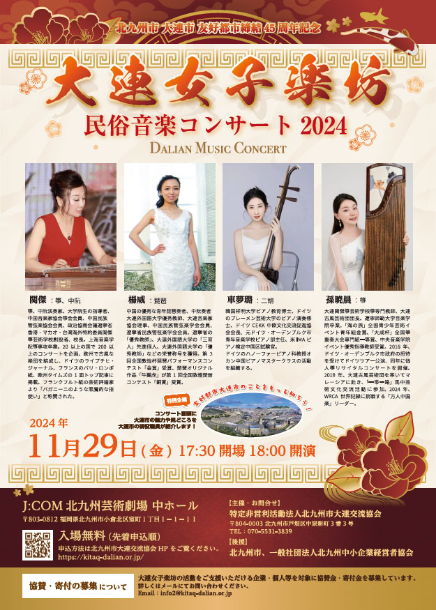 J:com北九州芸術劇場中ホールにて、「大連女子楽坊民俗音楽コンサート2024」を開催いたしました。当日は250名以上の方が来場され、日常では聞く機会の少ない中国民俗音楽に直に触れていただくことができました。